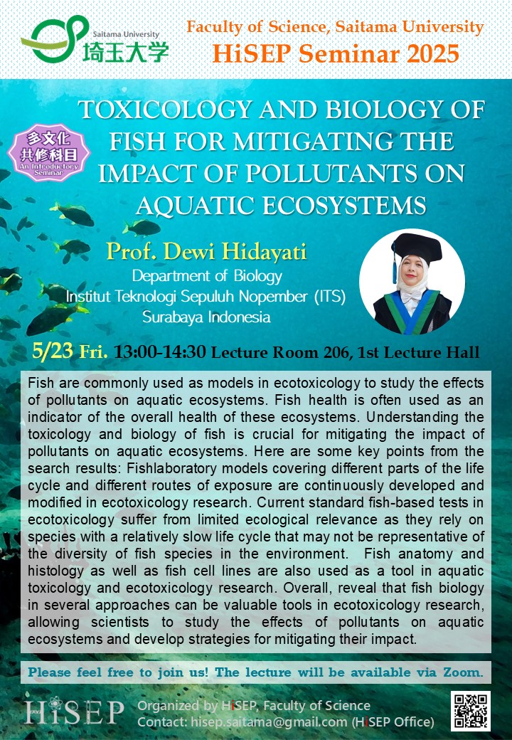 第4回理学部HiSEPセミナー(5月23日(金)3限に開催)は、インドネシア・スラバヤ市のITS大学からProf. Dewi Hidayti さんの英語セミナーを企画しました。魚に焦点を当てて、その生態と環境問題に向けての研究活用などについて、生物・環境系の話題からわかりやすい内容のお話しをお願いしています。学部・学科を問わず多くの学生の皆さんのご参加をお待ちしています。