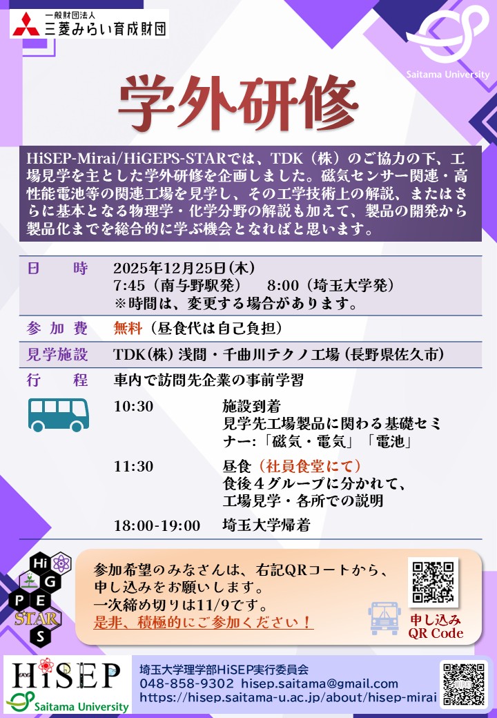 2025年12月25日 HiSEP・HiGEPS-STAR学外研修 TDK(株)長野工場 について(二次募集開始)