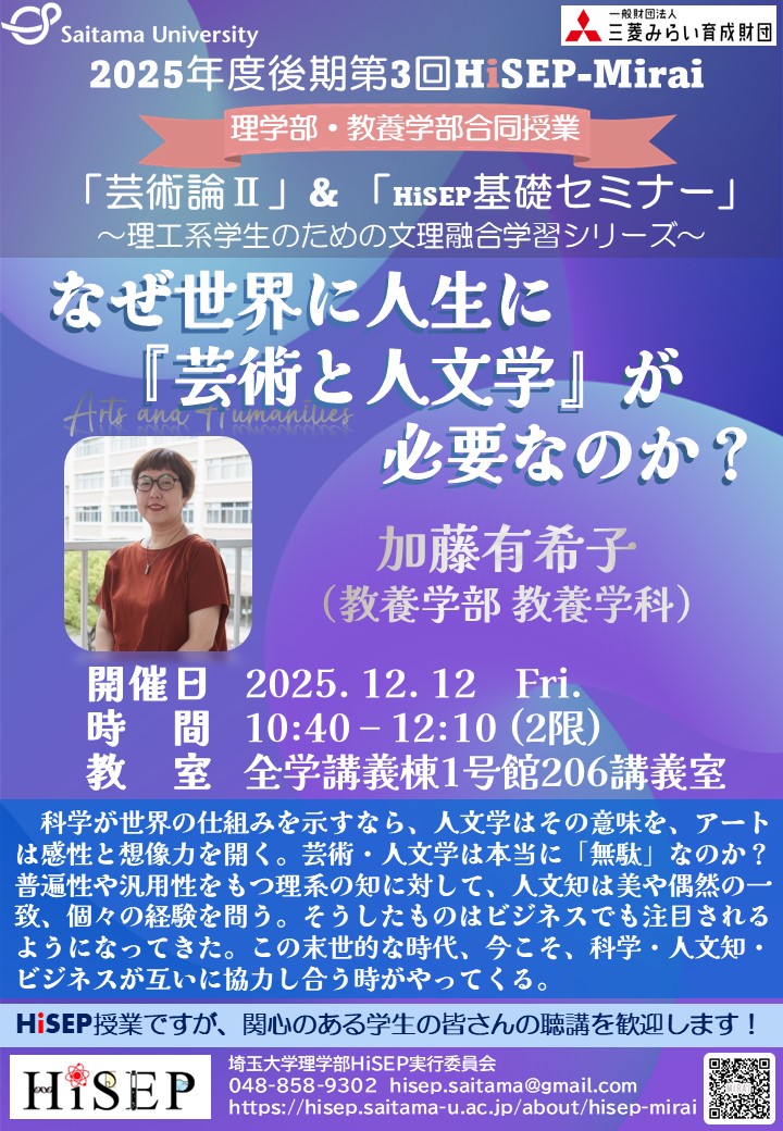 「第3回HiSEP-Mirai 基礎セミナー (2025.12.12 教養学部 加藤有希子さん」 開催のお知らせ