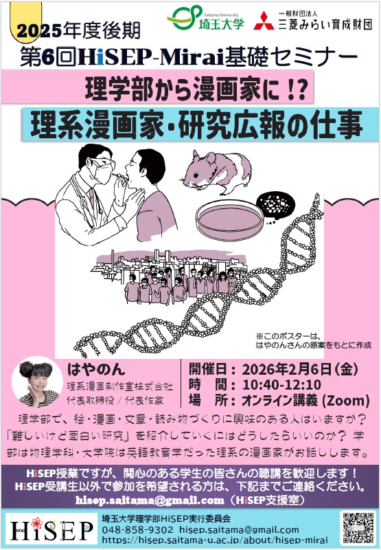 後期第6回理学部HiSEP-Miraiセミナー(2月6日(金)2限に開催)は、理系漫画制作室(株)代表作家 はやのん さんをお招きして下記のタイトル、概要でお話いただく予定です。理学を学ぶ皆さんにとって、「科学コミュニッケ-ション」を学ぶ・実践する中でのメソッドとして「漫画」を切り口にお話しいただく予定です。学部を問わず、関心ある学生の皆さんの参加を歓迎します。